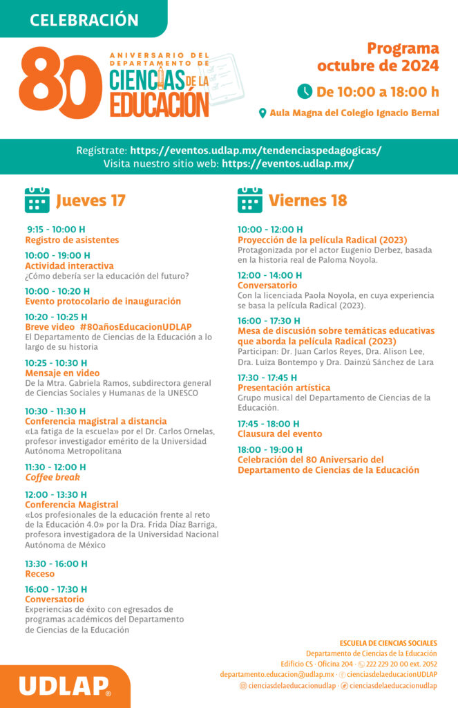 Desde su fundación hace 80 años, el Departamento de Ciencias de la Educación de la Universidad de las Américas Puebla (UDLAP) ha formado a generaciones de profesionales exitosos, y su programa de Pedagogía es considerado uno de los mejores de todo el país; a propósito de esto, este 17 y 18 de octubre de 10:00 a 18:00 horas se realizará un evento académico híbrido que reunirá a diferentes especialistas para analizar temáticas actuales respecto a la educación y sus retos.