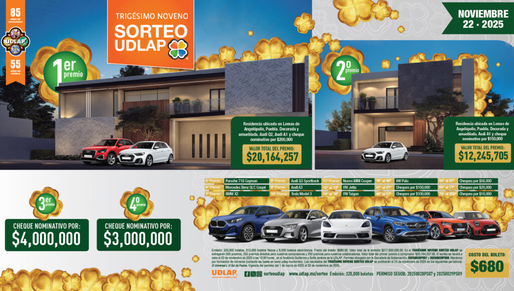 Recuerda que este sorteo se llevará a cabo el sábado 22 de noviembre 2025, a las 12:00 horas, en el Auditorio Guillermo y Sofía Jenkins de la Universidad de las Américas Puebla. La invitación es abierta al público y además se transmitirá por el canal de internet www.tvudlap.mx y por www.facebook.com/sorteoudlap.