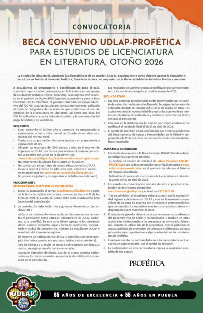 Para más información, los interesados pueden comunicarse al correo beca.literatura@udlap.mx, al teléfono 222 229 31 02, o consultar el sitio oficial de la UDLAP, así como en el siguiente enlace: https://online.udlap.mx/apoyoeducativo/files/convocatorias/convocatoriaUDLAP-profetica2025.pdf.