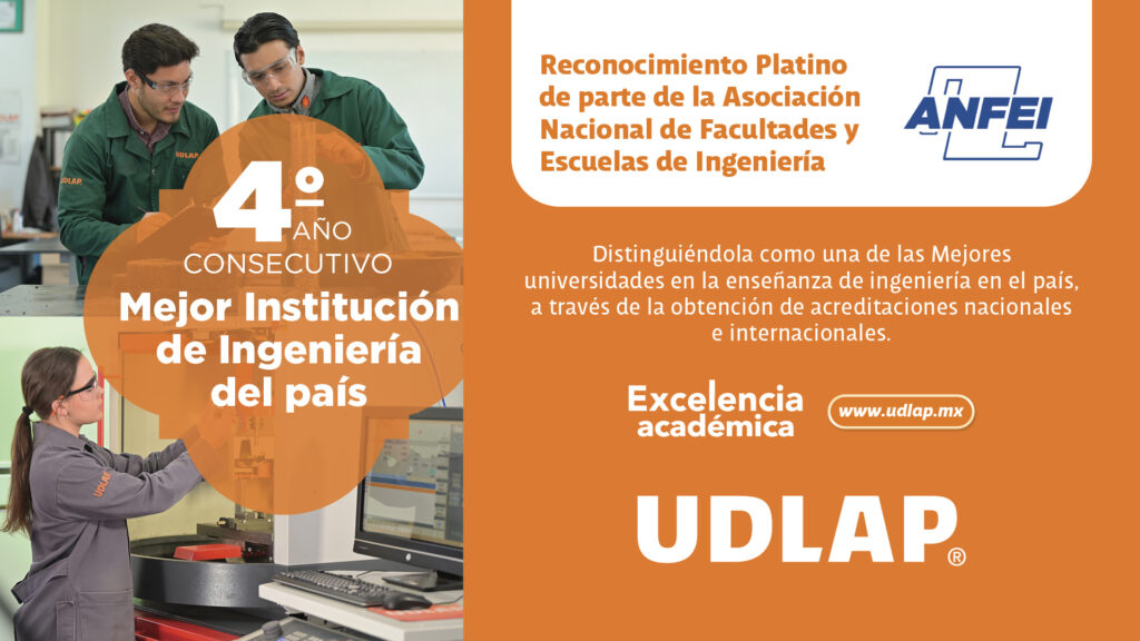 La Universidad de las Américas Puebla (UDLAP) recibió el reconocimiento Platino otorgado por parte de la Asociación Nacional de Facultades y Escuelas de Ingeniería (ANFEI), distinción que la ubica en el top 5 como una de las mejores instituciones en la enseñanza de ingeniería en el país, gracias a la obtención de acreditaciones nacionales e internacionales, brindar instalaciones de primer nivel a sus estudiantes, planes de estudio de excelencia, entre otros rubros calificados.