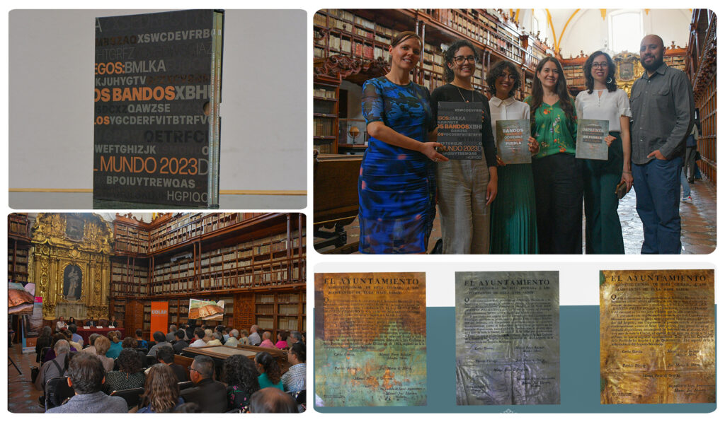 Para la segunda obra, los investigadores y personal del archivo involucrados en “Bandos para el buen Gobierno de la Ciudad de Puebla” se enfocaron en reunir documentos oficiales en donde las autoridades publicaron las normas para regular la vida en la ciudad, destacando por tener un soporte metálico con acabado en colores oro, plata y bronce. En este volumen, los diseñadores y editores de la UDLAP se encargaron de mostrar en todo su esplendor, desde las tipografías, los colores, el uso de una tinta especial para ciertas páginas, el acabado en la portada que hace alusión a los soportes y una hoja en díptico que muestra anuncios de 1822. “El libro tiene muchas características interesantes, por ejemplo, la impresión se hace con cuatro tintas, pero aquí hay una quinta que es metálica que va directa a todo el libro y lo que quisimos hacer es que el impresor luciera su trabajo”, explicó la Mtra. Rosa Quintanilla Martínez, jefa del Departamento de Publicaciones de la UDLAP.