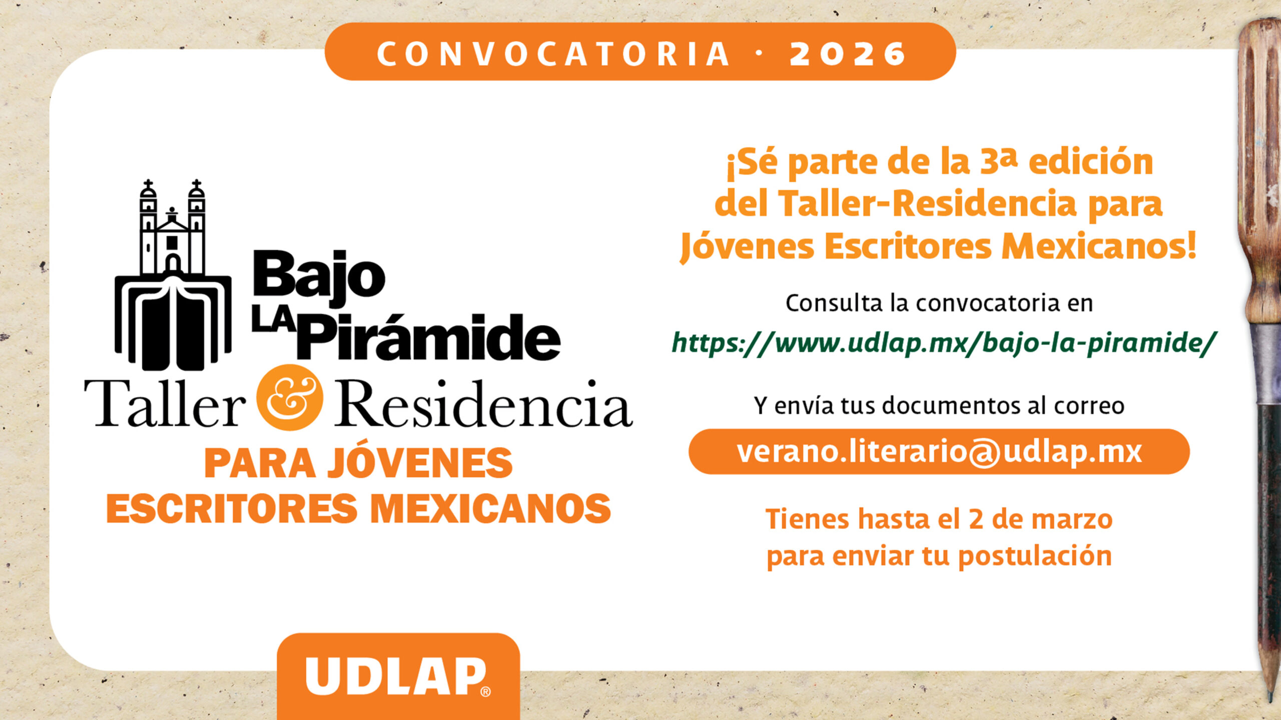 Gracias al éxito obtenido en ediciones pasadas, la Universidad de las Américas Puebla (UDLAP), a través del Departamento de Letras y Humanidades, convoca a jóvenes escritores mexicanos a postularse a la tercera edición del Taller-Residencia Bajo la Pirámide, actividad que se realizará del 8 al 19 de junio de 2026, con el objetivo de fomentar la literatura, su ejercicio riguroso, sus búsquedas y su mayor circulación.