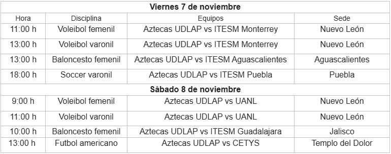 Los Aztecas UDLAP se alistan para enfrentar una exigente jornada deportiva, que los llevará a disputar 7 juegos como visitantes este fin de semana en distintas sedes del país, más la definición de la temporada de futbol americano de la ONEFA donde el representativo de la Universidad de las Américas Puebla recibirá, en el Templo del Dolor, a los Zorros CETYS el próximo sábado 8 de noviembre a las 13:00 horas.