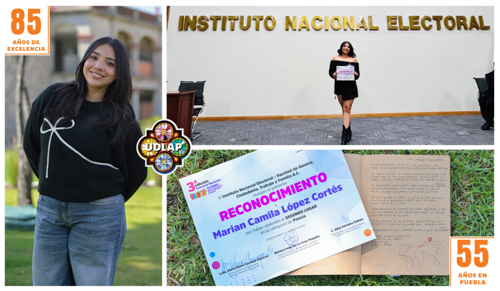 Marian Camila López Cortés, estudiante de las licenciaturas en Relaciones Multiculturales y Relaciones Internacionales de la Universidad de las Américas Puebla (UDLAP), obtuvo el segundo lugar de la categoría Poesía, en la tercera edición del Concurso Nacional “Tejiendo Redes Ciudadanas por Juventudes Diversas”, actividad organizada por el Instituto Nacional Electoral y la Organización de Equidad de Género, Ciudadanía, Trabajo y Familia A.C.