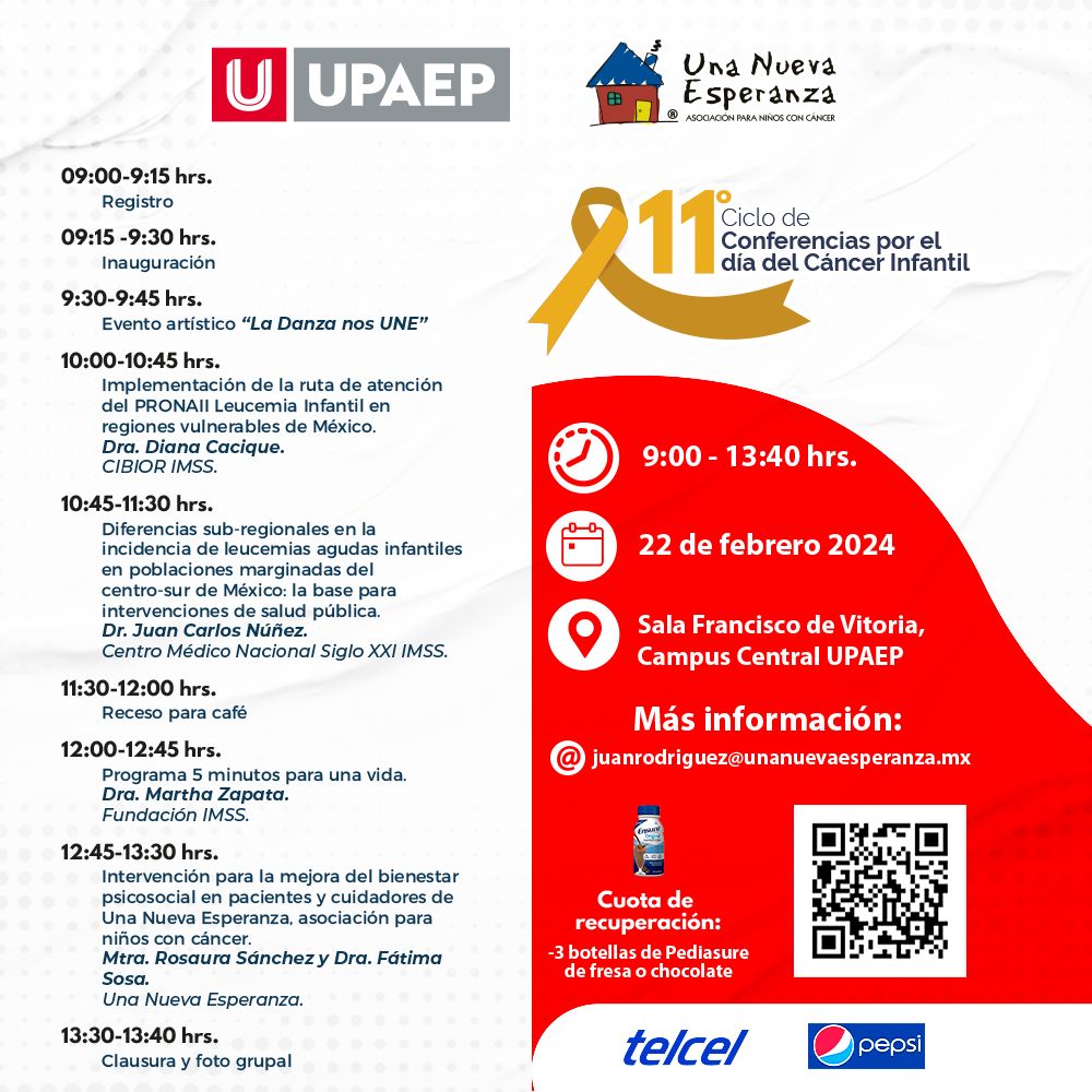 Baños Lara recordó la fecha de este ciclo de conferencias que se llevará a cabo en la Sala Francisco de Vitoria de la UPAEP, el próximo jueves 22 de febrero de 2024 de 9:00 a 14:00 horas. La entrada es gratuita, pero se solicita una donación de tres botellas de suplemento alimenticio para apoyar a Una Nueva Esperanza.