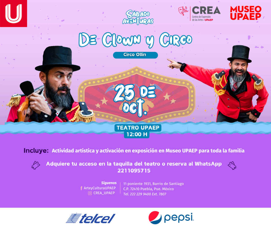 Sábado Aventuras presenta De Clown y Circo con Circo Ollin + Activación en Museo UPAEP es un espectáculo multidisciplinario en el que se conjuga la magia del circo con la originalidad y naturalidad clownesca de quien lo ejecuta. La nobleza del circo siempre será que tiene las puertas abiertas para público de todas las edades. Presentando en esta ocasión a: Chako, personaje misterioso que utilizará su magia para cautivar al público