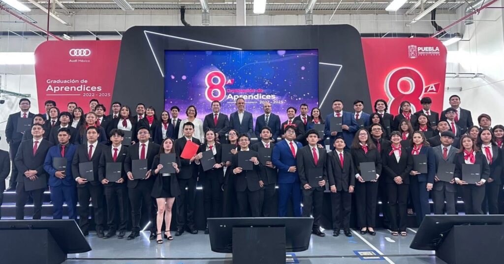 De manera coordinada Audi y la Universidad Tecnológica de Puebla, llevaron a cabo la ceremonia de graduación de 56 aprendices de Audi México, quienes concluyeron exitosamente su formación en el Centro de Especialización de Recursos Humanos de Alto Nivel (CERHAN), espacio académico diseñado para fortalecer el talento especializado que demanda la industria automotriz de vanguardia.