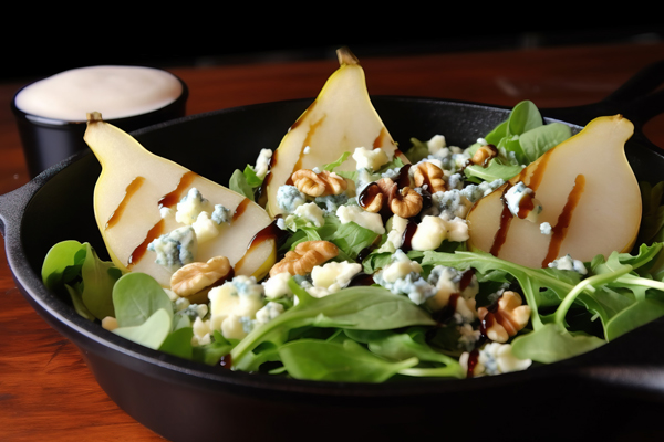 - En un bowl sirve una base de lechuga seguido por las peras y trocea el queso azul sobre la ensalada.