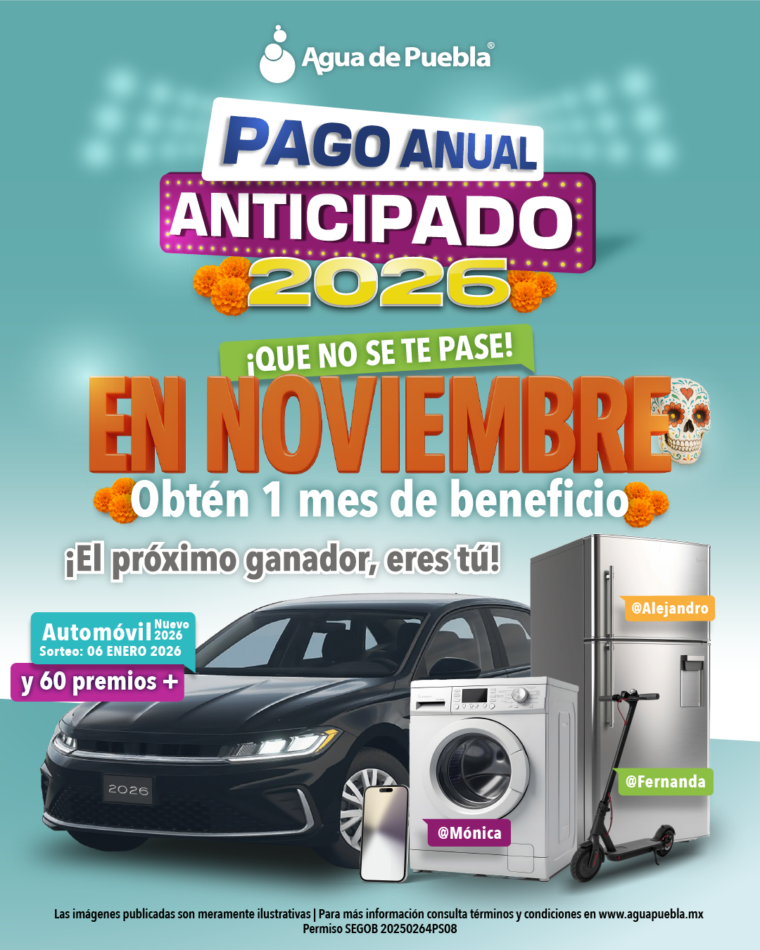 Quienes realicen su Pago Anual en noviembre congelan además su tarifa actual del 2025 para todo el año 2026 y participan automáticamente en las dos grandes rifas de Agua de Puebla al recibir 8 boletos. Si han pagado su anualidad en los últimos 5 años consecutivos recibirán el doble de boletos. Las rifas se llevarán a cabo: