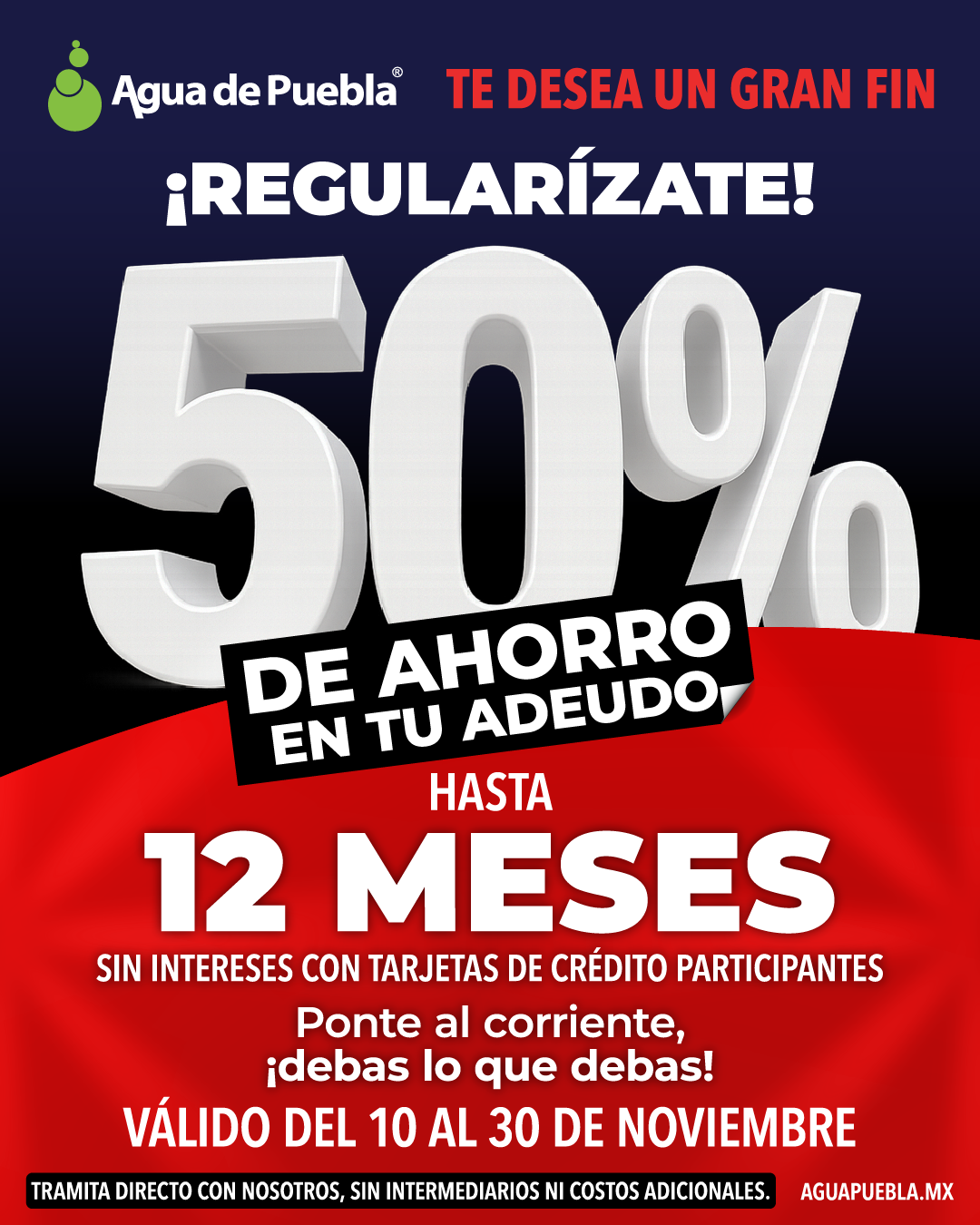 Agua de Puebla invita a todos los usuarios de uso doméstico a aprovechar el “Gran Fin de Ahorros” a partir del 10 al 31 de noviembre: