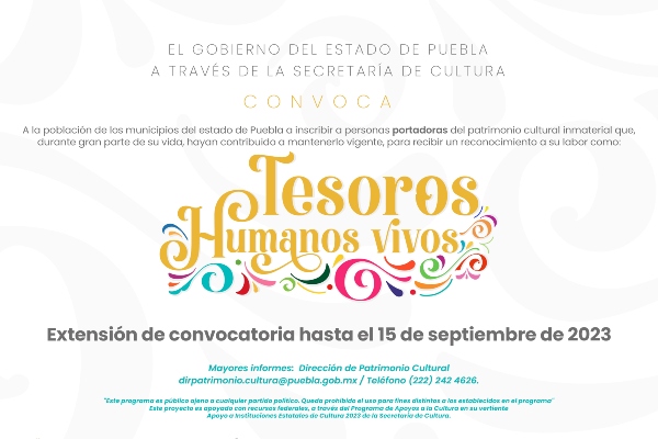 El gobierno presente de Sergio Salomón, por medio de la Secretaría de Cultura, amplió del 31 de agosto al 15 de septiembre el plazo de recepción de propuestas para la convocatoria “Tesoros Humanos Vivos”, la cual busca reconocer a adultos mayores de 70 años que sean portadores del patrimonio cultural inmaterial del estado.