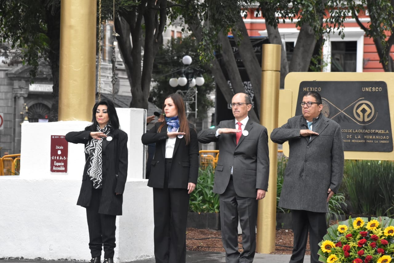 Debido a que en esta fecha también se celebra el 36° Aniversario de la Inscripción del Centro Histórico en la Lista del Patrimonio Mundial y el 8° Aniversario de Puebla Ciudad Creativa del Diseño, autoridades locales, encabezadas por Adán Domínguez Sánchez, Gerente Municipal, celebraron una ceremonia cívica conmemorativa en la plancha del Zócalo.