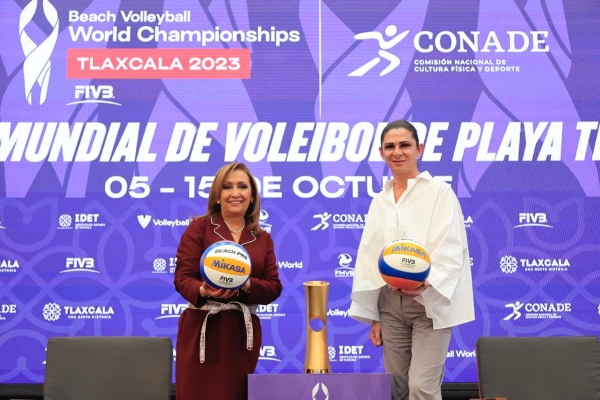 La gobernadora Lorena Cuéllar Cisneros y la directora de la Comisión Nacional de Cultura Física y Deporte (Conade), Ana Gabriela Guevara, presentaron oficialmente el Mundial de Voleibol de Playa Tlaxcala 2023, que se llevará a cabo del 5 al 15 de octubre.