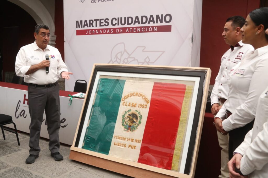 Como parte de las acciones para rescatar el patrimonio cultural de Puebla y fortalecer la identidad de cada localidad, el gobernador Sergio Salomón entregó la Bandera restaurada del municipio de Libres, Conscripción 1933.