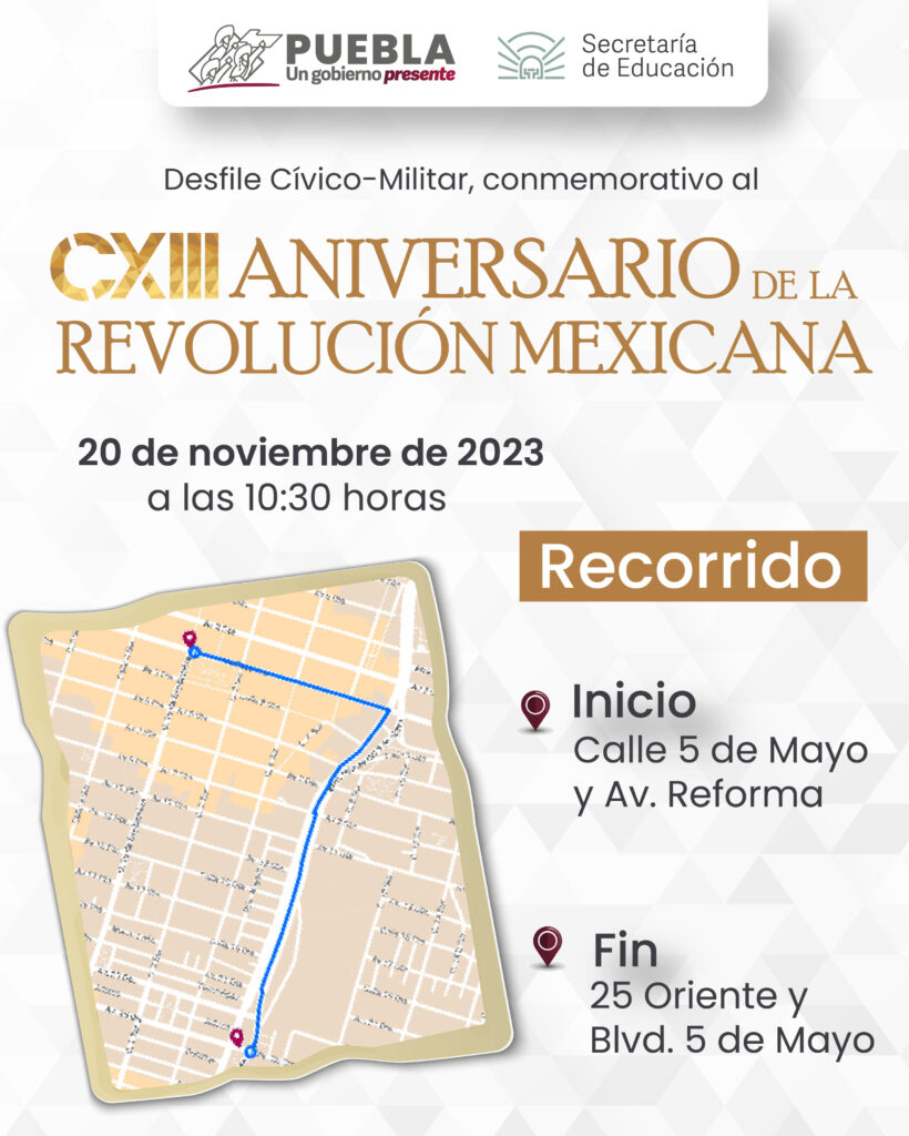 Para promover la memoria de hechos relevantes e históricos de México, el gobierno de Puebla, a través de la Secretaría de Educación, informa que un total de 24 planteles educativos (secundaria, media superior y superior) participarán en el Desfile Cívico-Militar conmemorativo al “CXIII Aniversario del Inicio de la Revolución Mexicana” a realizarse el lunes 20 de noviembre a las 10:30 horas.