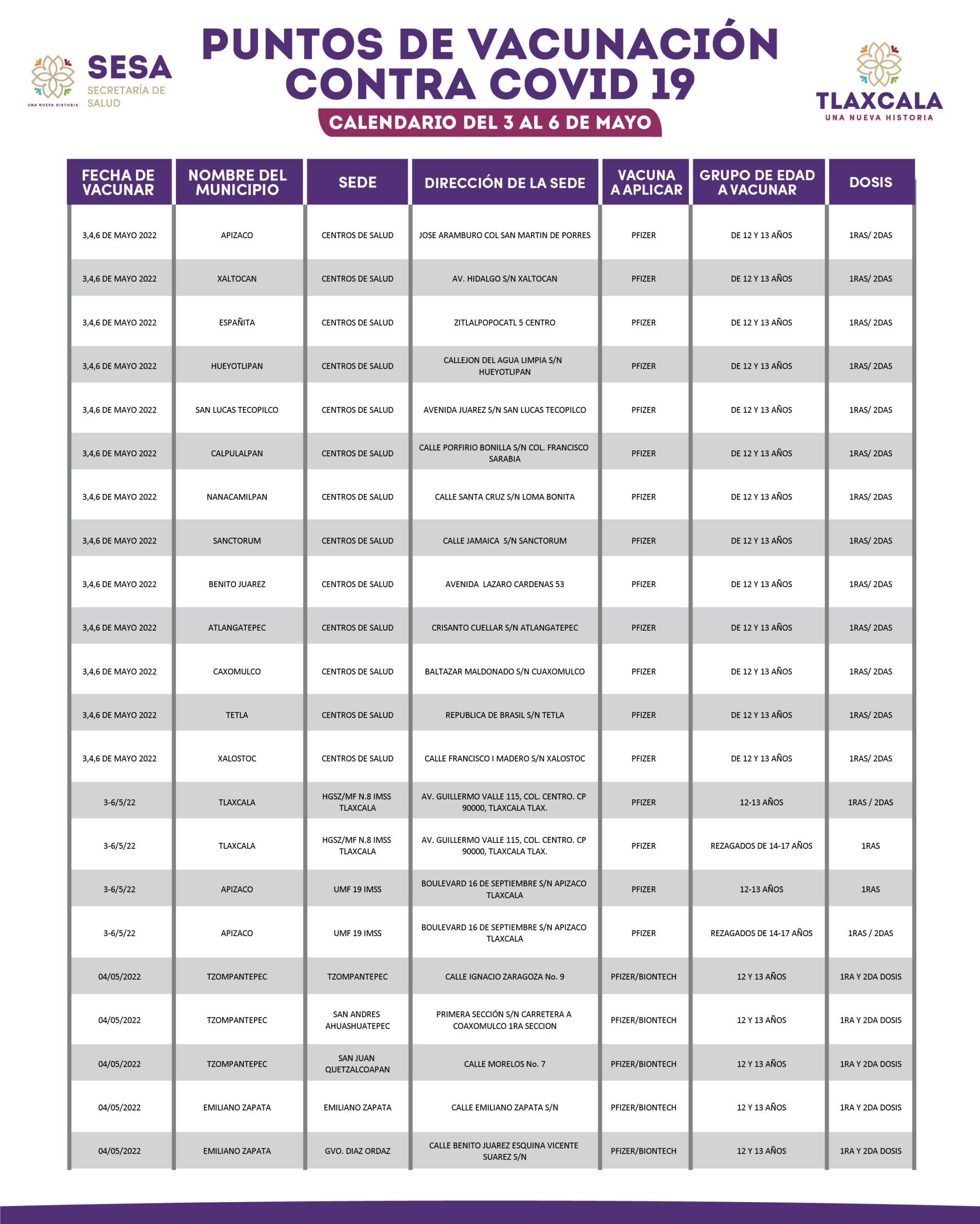 En el marco de la Estrategia Nacional de Vacunación, a partir de este martes 3 de mayo y hasta el día 13 del mismo mes, el Gobierno de Tlaxcala, a través de las secretarías de Salud y de Educación, inicia la aplicación de 35 mil dosis a niñas y niños de 12 y 13 años de edad de la vacuna Pfizer contra el Covid-19, sin suspender actividades escolares.