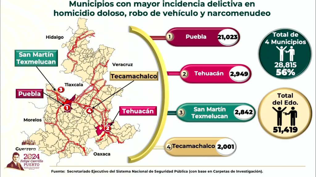 Mencionó que la mayor actividad delictiva en la entidad se concentra en 4 municipios: Puebla, Tehuacán, Texmelucan y Tecamachalco. En estas demarcaciones ocurrieron 56% de los delitos registrados en un solo año, lo que equivale a 28 mil 815 carpetas de investigación.