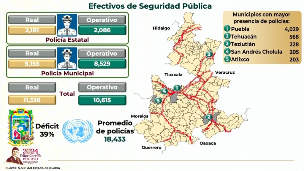 Los municipios de Puebla, Tehuacán, Teziutlán, San Andrés Cholula y Atlixco son los que tienen el mayor número de policías en el estado.