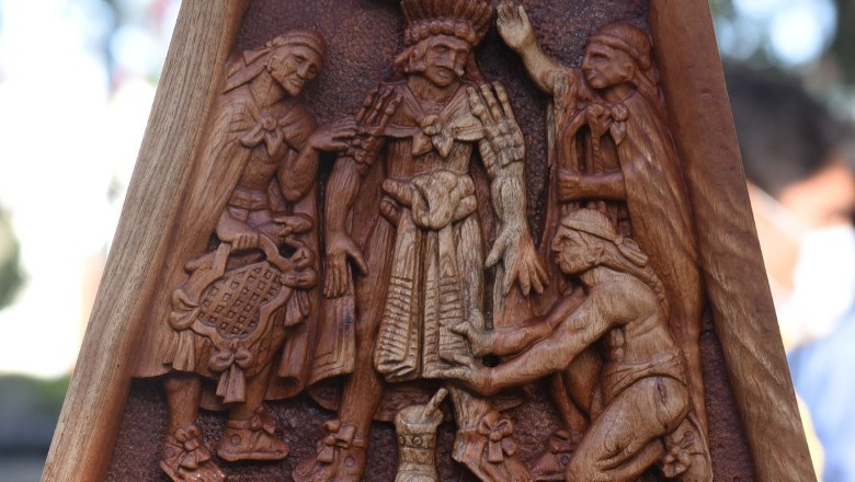 El artista detalló que esta pieza fue tallada en madera de cedro durante un año y posee elementos alegóricos a la cultura tlaxcalteca, su historia y tradiciones más arraigadas.