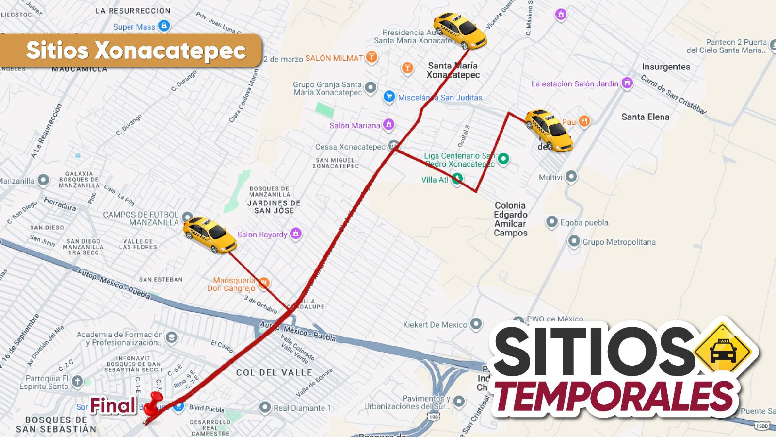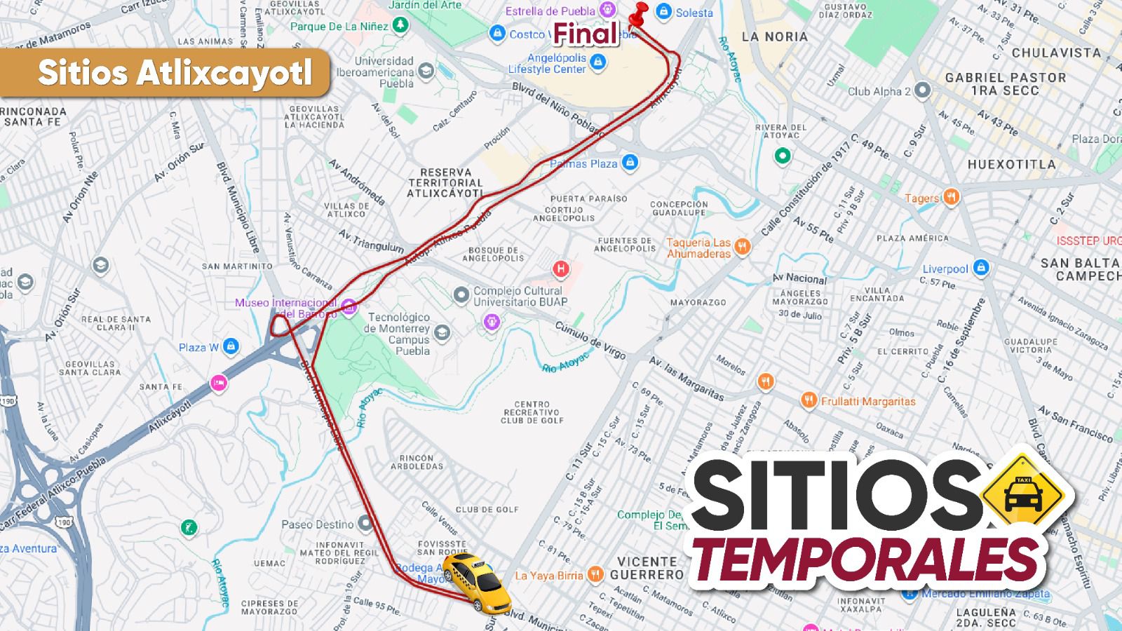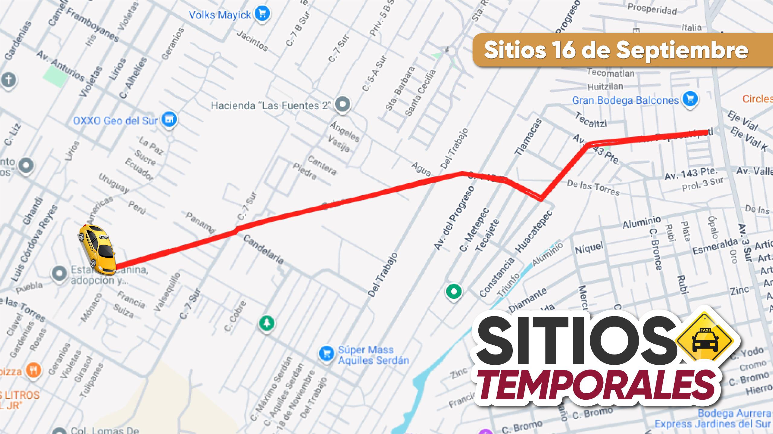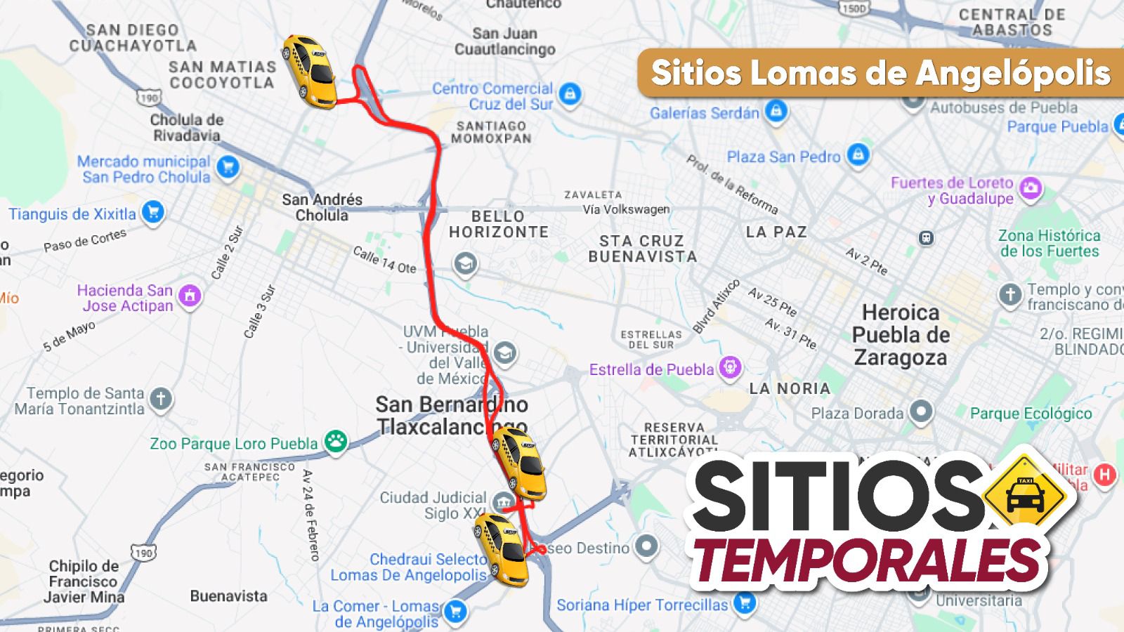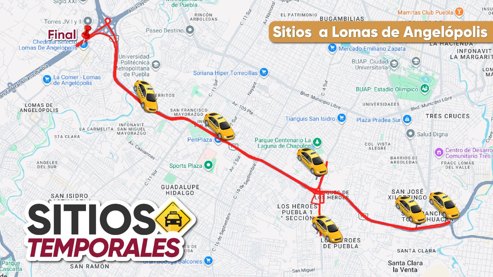 Respecto a los sitios de taxi temporales, estarán disponibles 210 unidades amarillo-negro para los viajes grupales, desde: Lomas de Angelópolis; Periférico-24 sur; Lateral de 14 sur; Fraccionamiento Héroes de Puebla; Carmelitas-Periférico; Ciudad Judicial-Periférico; Plaza San Diego; Minerales del Sur; 11 Sur-Las Torres, por mencionar algunos.
