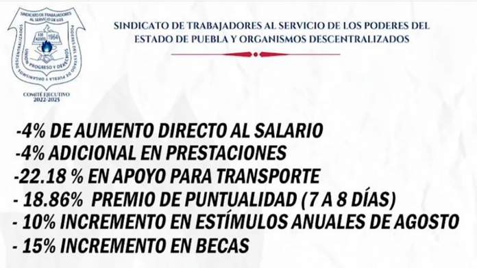 Como resultado de las mesas de diálogo entre representantes de la Administración Pública y del Sindicato, también se acordó un aumento adicional del 4 por ciento en prestaciones, retroactivo igualmente al 1 de julio. Además, se pactó un incremento del 22.18 por ciento en apoyos para transporte, del 18.86 por ciento en el premio de puntualidad (de siete a ocho días), del 10 por ciento en estímulos anuales de agosto y del 15 por ciento en becas.
