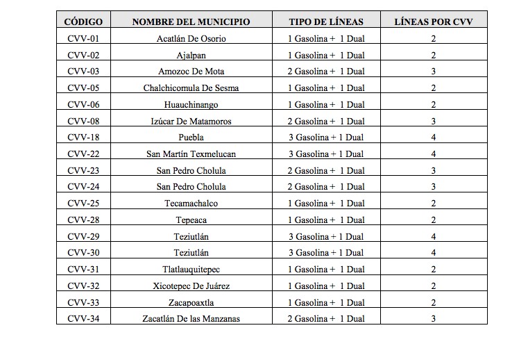 Los municipios donde ya se eligió a los concesionarios son: uno en Atlixco, uno en Huejotzingo, 9 en Puebla, 2 en San Andrés Cholula, uno en Texmelucan y dos en Tehuacán.