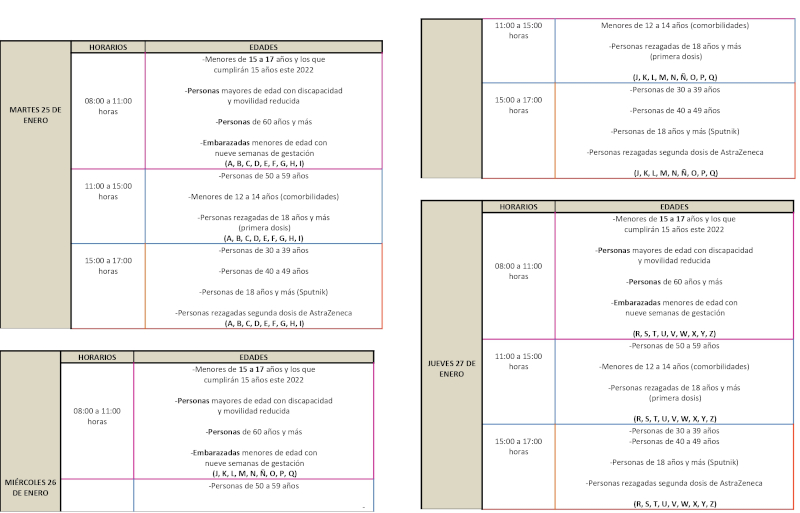 Se recomiendan a la población respetar los lineamientos establecidos como son: DÍA de acuerdo con la letra inicial del primer apellido, HORA conforme a la edad de la persona que acuda a solicitar el biológico y LUGAR, donde recibieron la primera recibirán la segunda dosis. Los que acudirán para el refuerzo, así como los rezagados y (primera dosis), tendrán que consultar su módulo de vacunación con base a su colonia o localidad.