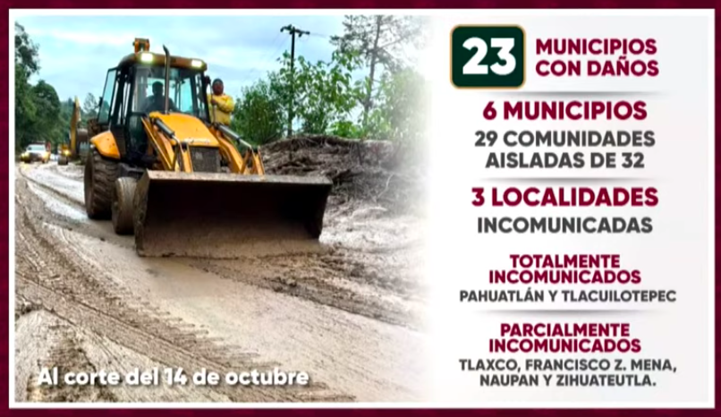 Mencionó que los tramos carreteros afectados suman 134.8 kilómetros con 404 deslaves, y en nueve municipios se han reabierto caminos, destacando: Francisco Z. Mena, Zihuateutla, Xicotepec de Juárez, además de Naupan y Chignahuapan. Además hay 19 puentes destruidos en 10 municipios.