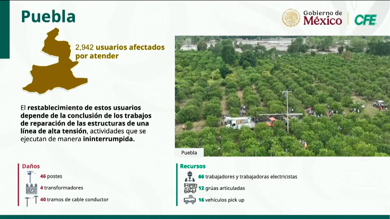 Derivado de los efectos de las lluvias torrenciales registradas en el estado de Puebla, aún hay 2 mil 942 poblanos que carecen del servicio de energía eléctrica por los daños a caminos que impiden el acceso a las brigadas de la Comisión Federal de Electricidad (CFE).
