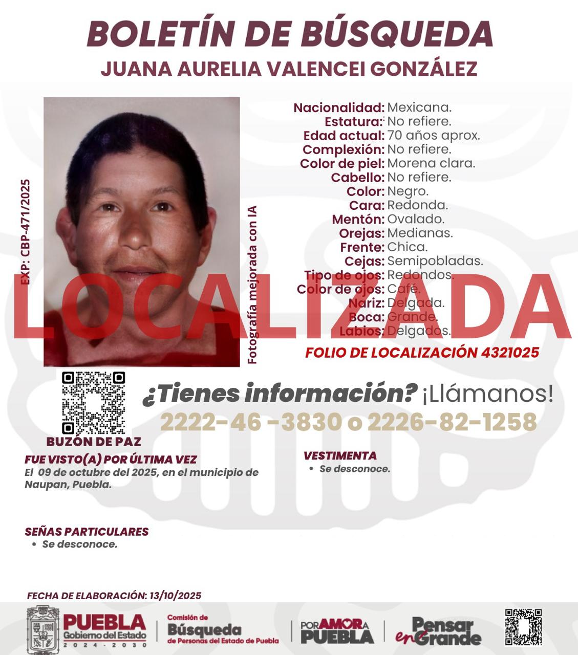 • Juana Aurelia Valencei González, de 70 años, originaria del municipio de Naupan.