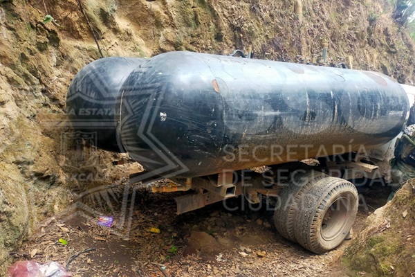 En una nueva acción, ambas dependencias de seguridad aseguraron una camioneta Dodge Ram tipo D-350 de color blanca y con placas de Oaxaca, la cual estaba acoplada a dos tanques de aproximadamente cinco mil litros de capacidad y que desprendían un fuerte olor a Gas L.P.