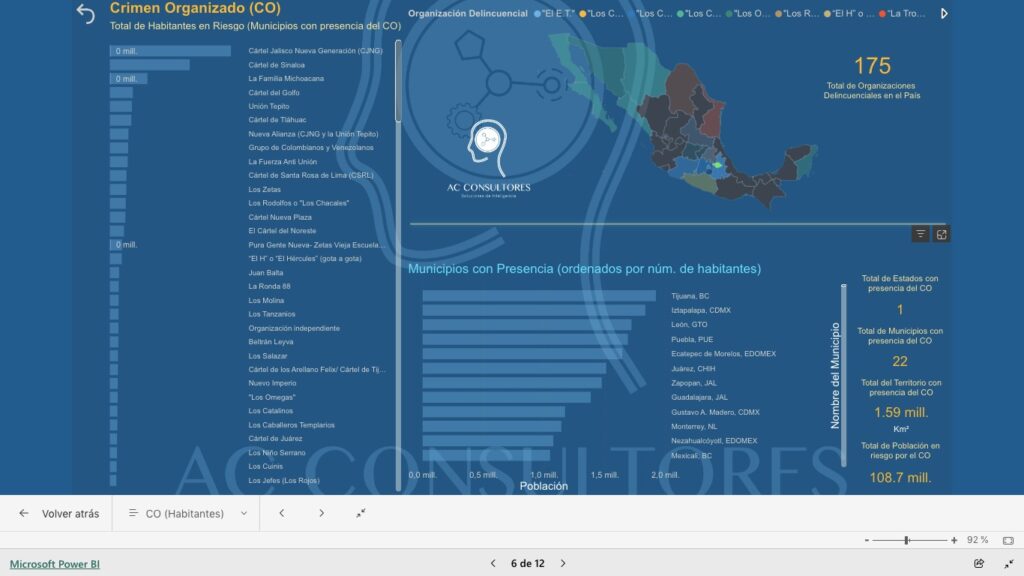 AC Consultores contempló en el informe a 2 mil 471 municipios. De estos, en 427 hay presencia del CJNG, mientras que el Cártel de Sinaloa opera en 293, por lo que se estima que alrededor de 91 mil habitantes se encuentran en una situación de “riesgo” por la irrupción de ambas organizaciones.