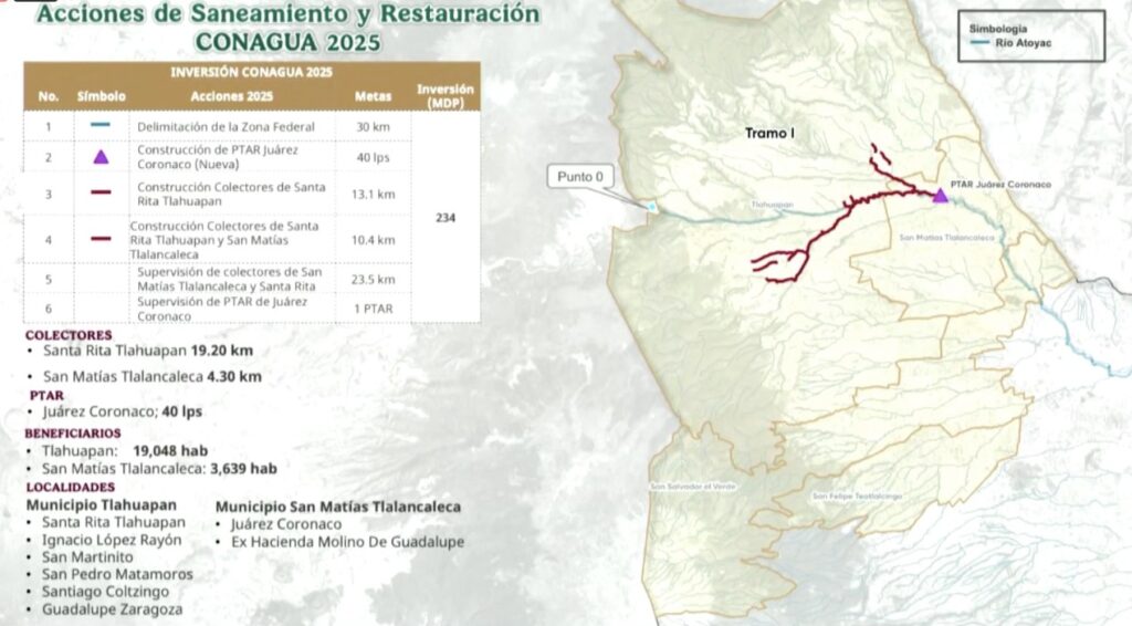 Durante la conferencia de prensa matutina del gobernador, Alejandro Armenta Mier, Martínez Orozco detalló que para el resto de este 2025 se invertirán 234 millones de pesos en la construcción de la Planta de Tratamiento Juárez-Coronaco, además de un colector que eliminará 210 descargas irregulares, y sistemas de tratamiento local que están destinados a pequeñas poblaciones. Adicionalmente se construirá un Humedal en Otlatla, que funcionará como una zona de tratamiento de agua mediante un método sustentable.