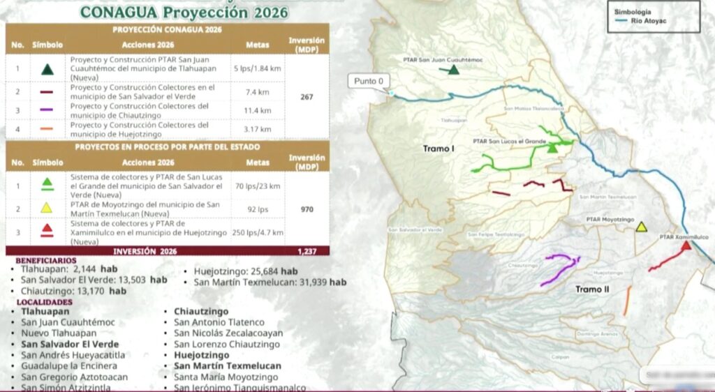 Para el 2026, el proyecto es invertir 1,500 millones de pesos en la construcción de las plantas de tratamiento de San Juan Cuauhtémoc y San Lucas El Grande, y sus respectivos colectores. A la par se están realizando estudios para aumentar la capacidad de la Planta de Tratamiento de Xalmimilulco, o en su caso, para construir otra planta en la junta auxiliar de Moyotzingo, en San Martín Texmelucan.