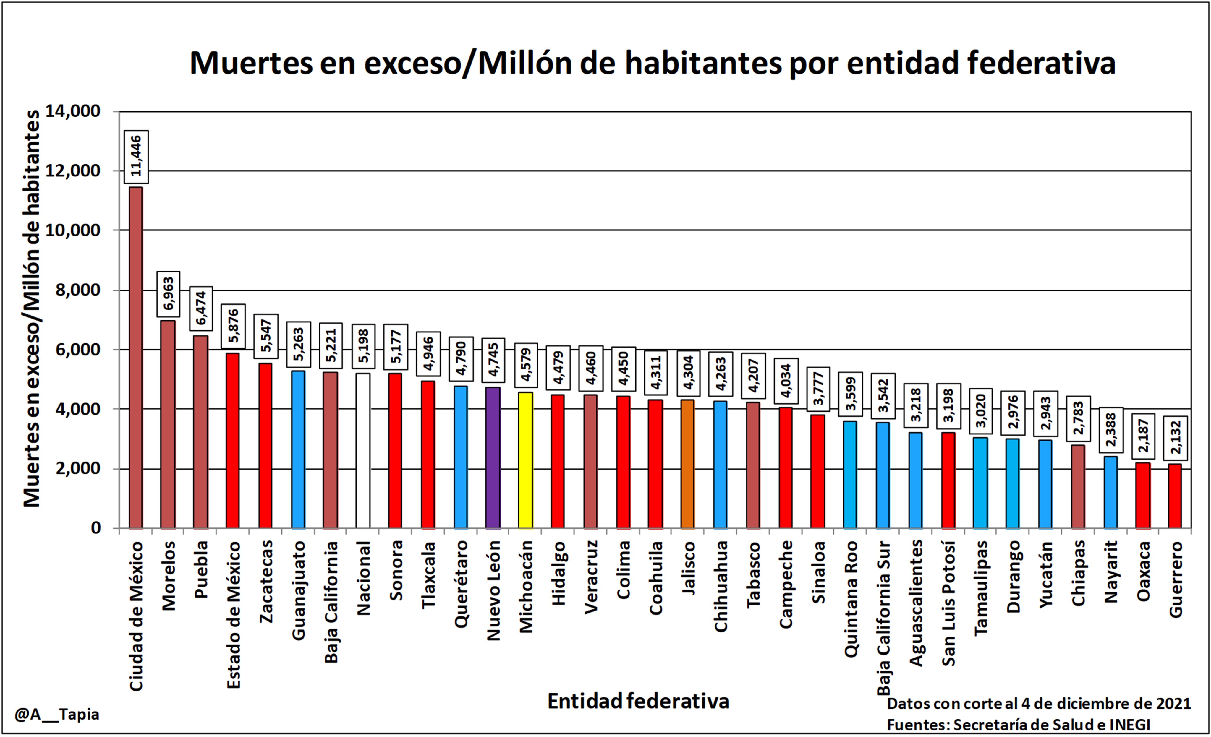 De acuerdo con la publicación en la cuenta de Twitter de @A-Tapia, internauta de la Facultad de Medicina de la UNAM dedicado a graficar datos abiertos, el exceso de muertes en Puebla fue mayor a la proporción nacional de 5 mil 189 muertes.