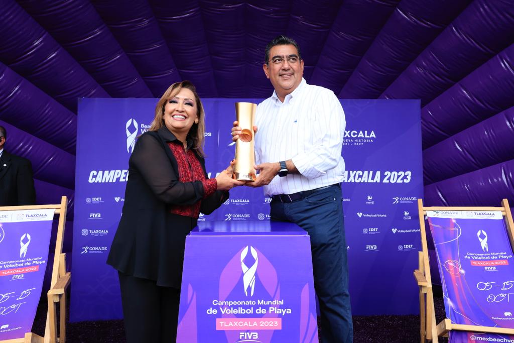 La gobernadora de Tlaxcala, Lorena Cuéllar Cisneros y su homólogo de Puebla, Sergio Salomón Céspedes Peregrina, develaron el trofeo que será entregado a los finalistas del Mundial de Voleibol de Playa Tlaxcala 2023, a realizarse del 5 al 15 de octubre.