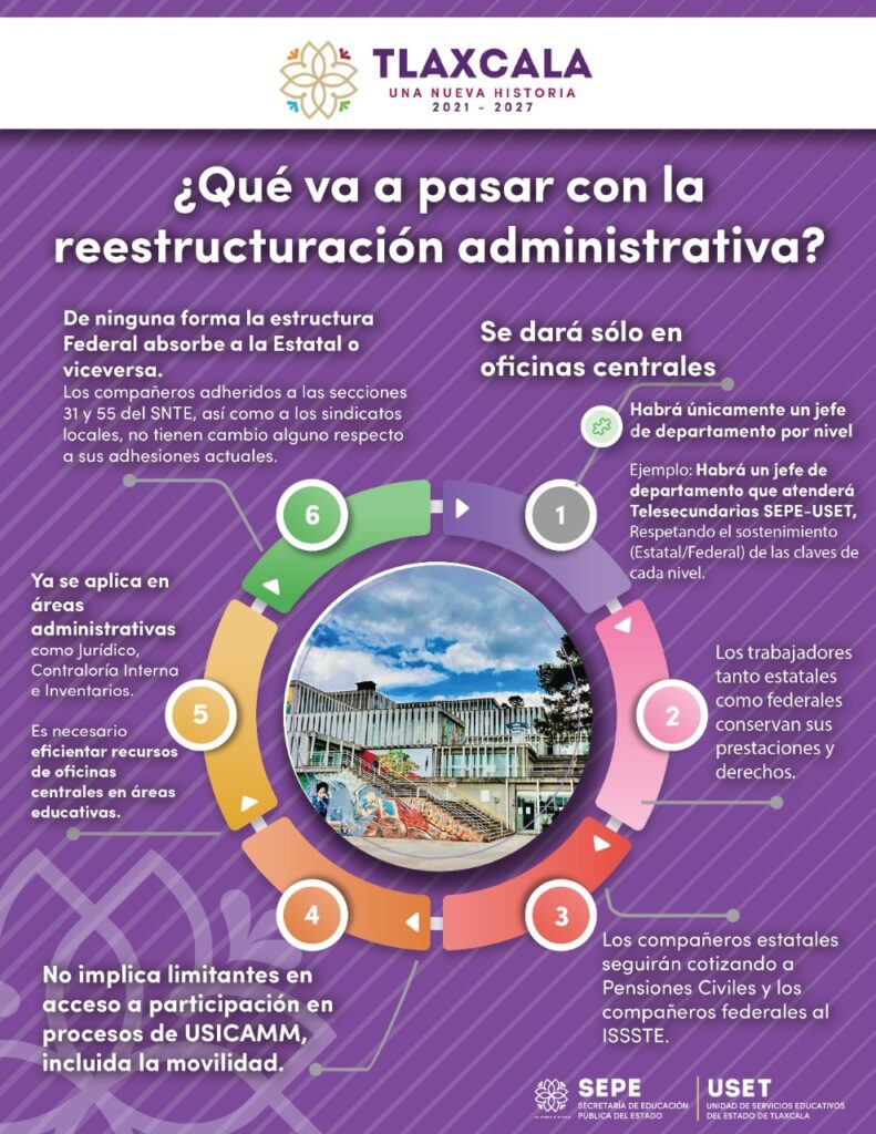 La Secretaría de Educación Pública del Estado y la Unidad de Servicios Educativos del Estado de Tlaxcala (SEPE–USET) se sumarán a la reestructuración administrativa que se efectúa a nivel federal, con el objetivo de eficientar los servicios y recursos de las oficinas centrales en áreas educativas.