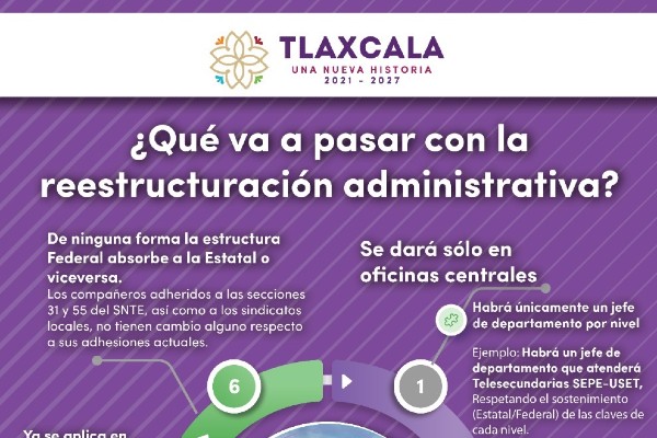 Precisar que este modelo estructural ya se aplica en diversas áreas administrativas, entre ellas Jurídica, Contraloría Interna e Inventarios, por lo que de ninguna forma la estructura federal absorberá a la estatal o viceversa. De igual manera, destacar que las y los adheridos a las secciones 31 y 55 del Sindicato Nacional de Trabajadores de la Educación (SNTE) y de sindicatos locales no tendrán ningún cambio respecto a sus adhesiones actuales.