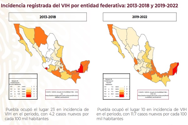 De acuerdo con el reporte titulado “Territorialización VIH, VHC y Sífilis”, elaborado por la Secretaría de Salud del gobierno federal, y Centro Nacional para la Prevención y Control del VIH y el sida (CENSIDA), Puebla se ubicó en el décimo lugar nacional con mayor incidencia en contagios de VIH con 11.7 nuevos casos por cada 100 mil habitantes, en el periodo 2019-2022.