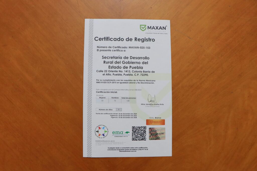 El Gobierno del Estado de Puebla, a través de la Secretaría de Desarrollo Rural, recibió el certificado de registro por su cumplimiento con los requisitos establecidos en la Norma Mexicana NMX-R-025-SCFI-2015 en Igualdad Laboral y No Discriminación.