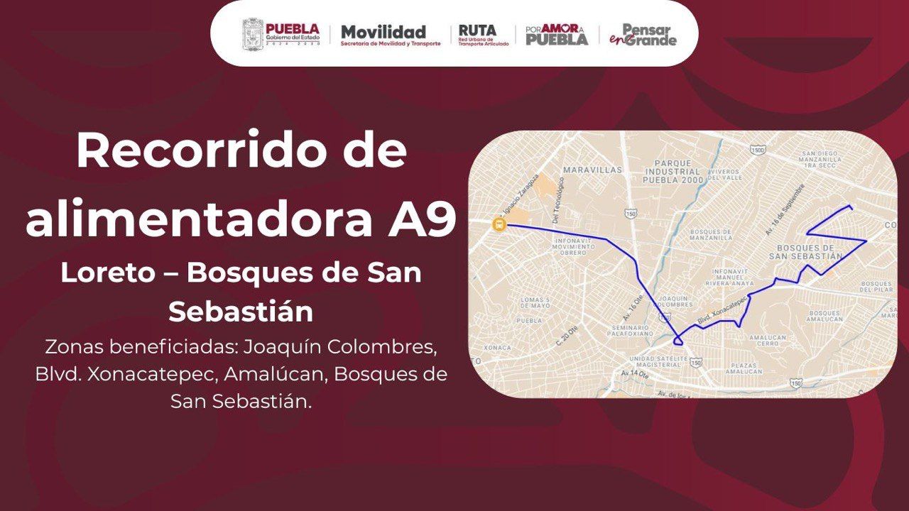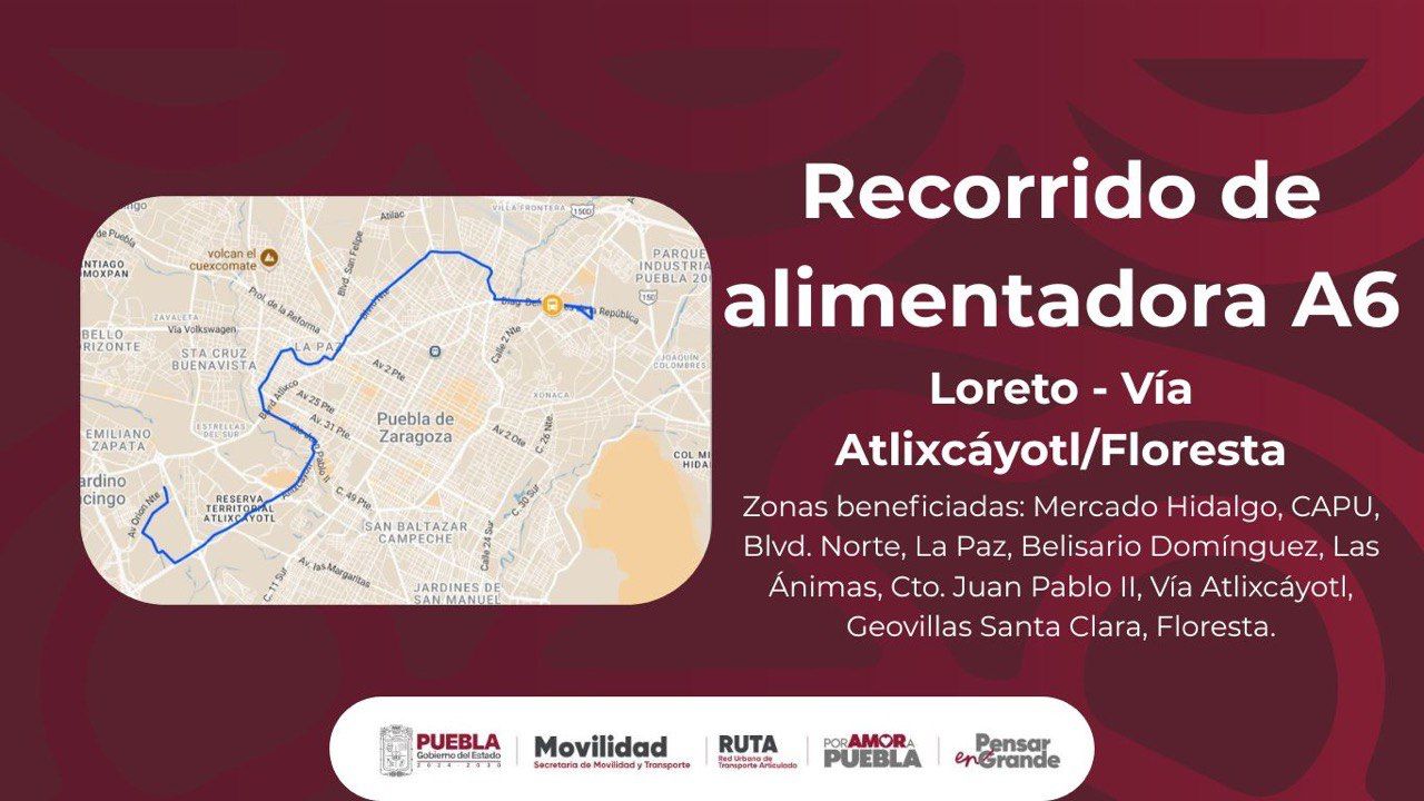Por medio del presente, se informa que, hoy lunes 24 de abril del presente año, Con motivo de la Feria de Puebla 2025, y a fin de otorgar un servicio seguro para sus visitantes, el Sistema RUTA dispondrá de 3 servicios alimentadores para trasladar a las personas usuarias desde la zona de Loreto hacia destinos como Bosques de San Sebastián, Vía Atlixcáyotl y Zavaleta. Las salidas serán cada 30 minutos. El acceso a los servicios será con tarjeta de prepago con saldo.