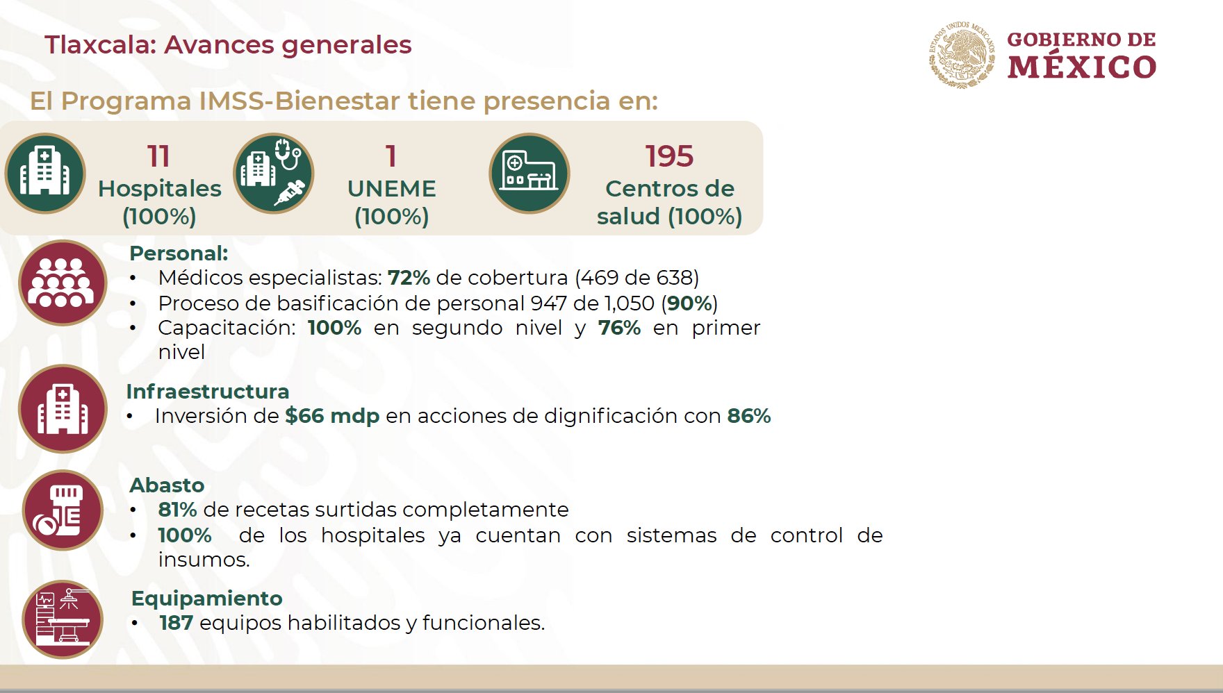 Tlaxcala es una de las entidades con el mayor avance de implementación. El nuevo esquema tiene presencia en los 11 hospitales y los 195 centros de salud; todos los hospitales de la entidad ya cuentan con un sistema de control de insumos para garantizar el abasto de medicamentos, lo que ha permitido surtir el 81 por ciento de las recetas médicas, informó esta mañana el titular del IMSS.