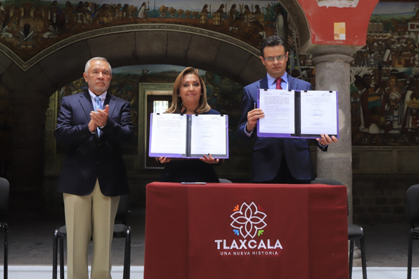 En el Patio Central de Palacio de Gobierno, la mandataria estatal resaltó que a través de la firma de este instrumento colaborativo se fortalece el trabajo coordinado y se reafirma la suma de voluntades para favorecer a los distintos sectores de la sociedad y lograr la justicia social, la paz y el bienestar de las familias tlaxcaltecas.