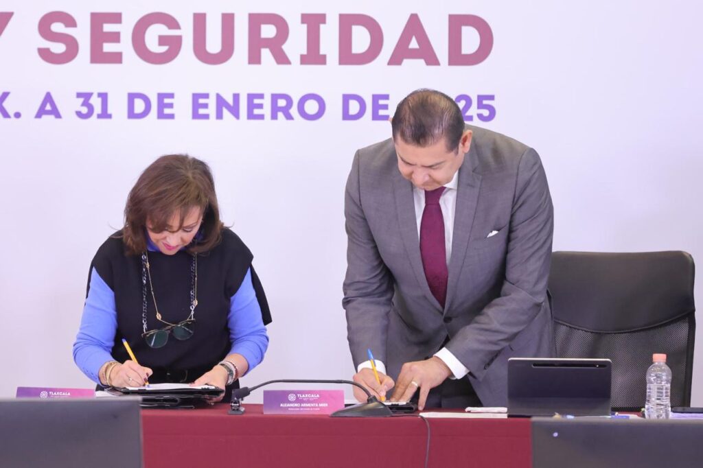La gobernadora de Tlaxcala, Lorena Cuéllar Cisneros y el gobernador de Puebla, Alejandro Armenta Mier, firmaron esta mañana el Convenio Marco de Coordinación y Colaboración para el Desarrollo de Áreas y Temas Comunes, así como el Convenio Específico en Materia de Procuración de Justicia, Seguridad Pública y Ciudadana.
