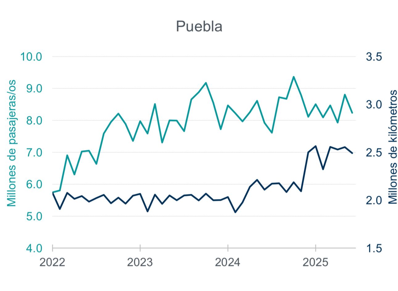 Llama la atención que en diciembre de 2024, cuando aumentó el kilometraje recorrido por los vehículos de RUTA, como consecuencia del inicio de operaciones de la Línea 4 en el Periférico Ecológico, disminuyó su número de pasajeros de 9.2 millones a 8.1 millones, sin que haya vuelto a alcanzar en todo el primer semestre el nivel de ese entonces.