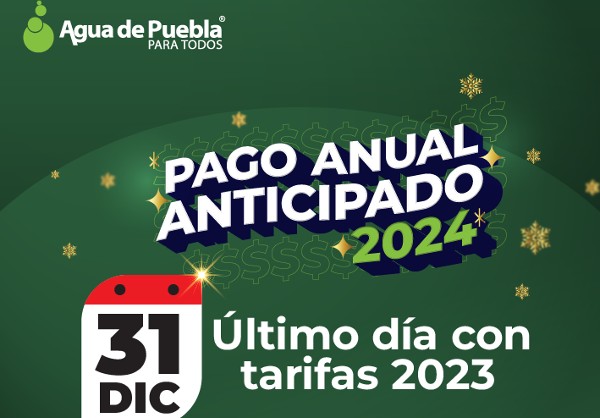 Agua de Puebla para Todos informa a los usuarios de agua potable, drenaje y saneamiento que el próximo 31 de diciembre es el último día del “Pago Anual Anticipado 2024” con el beneficio de que se mantienen las tarifas actuales del 2023, sin incremento alguno durante todo el año 2024.