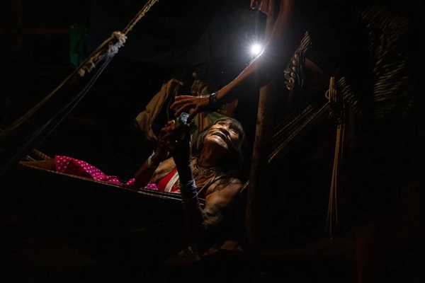 “¡Ten cuidado conmigo!”, le gritó a su hijo, Tama Txano Marubo (todos los miembros de la tribu marubo tienen el mismo apellido), mientras bajaba por un terraplén lodoso con un machete en una mano y su madre en la espalda. Todo el peso de su madre estaba sostenido en una tira de tela azul sujetada de la frente de Tama Txano. “¡Llamen un camión para que venga por mí!”, les gritó a unos parientes que reían. “Es demasiado”.
