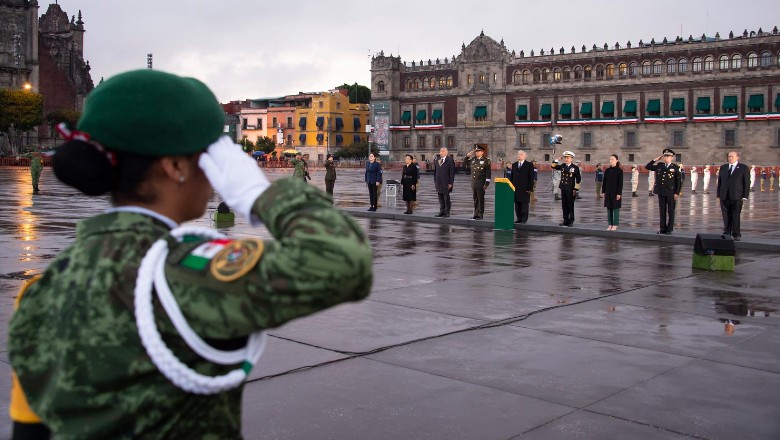 Mientras el símbolo patrio era izado, la banda de música y el coro de la Secretaría de la Defensa Nacional (Sedena) entonó el canto a la bandera para luego rendir honores al presidente y “comandante supremo de las fuerzas armadas”.