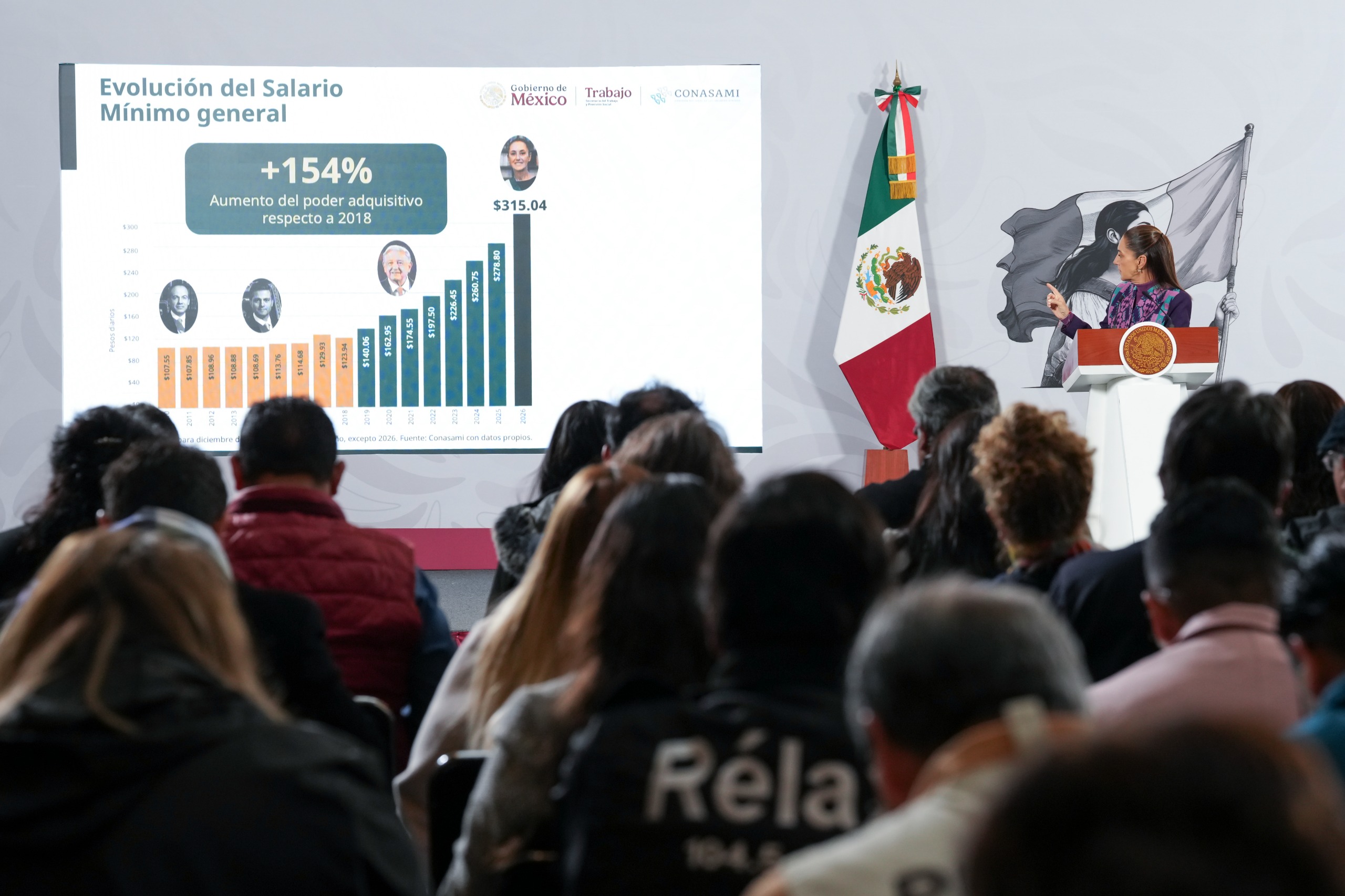 Durante la conferencia de prensa matutina de la presidenta Claudia Sheinbaum, se indicó que el salario mínimo pasará de 278.80 a 315.04 pesos diarios, equivalentes a 9,582.47 pesos mensuales, mientras que en la Zona Libre de la Frontera Norte el aumento será del 5%, para quedar en 440.87 pesos diarios (13,409.80 pesos mensuales).
