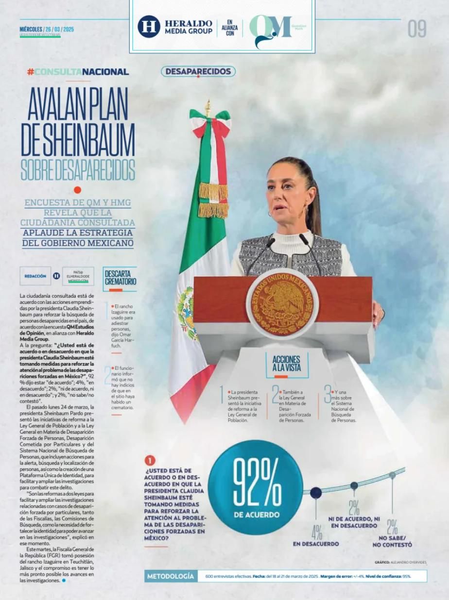 La ciudadanía consultada está de acuerdo con las acciones emprendidas por la presidenta Claudia Sheinbaum para reforzar la búsqueda de personas desaparecidas en el país, de acuerdo con la encuesta QM Estudios de Opinión, en alianza con Heraldo Media Group.
